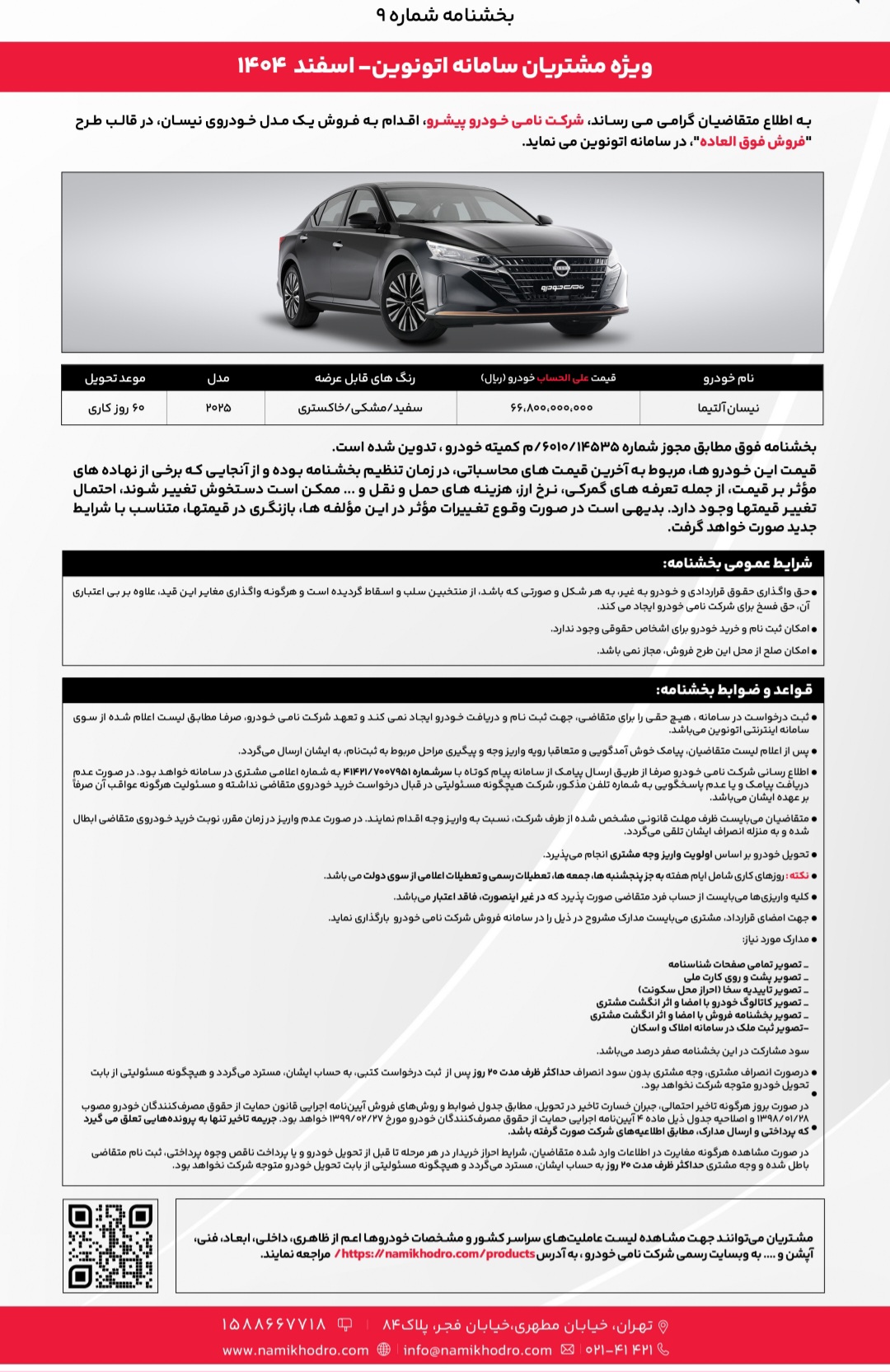 به گزارش عصر خدمات،شرکت نامی خودرو پیشرو اقدام به فروش خودروی نیسان آلتیما در قالب طرح فروش فوق العاده در سامانه اتونوین می نماید.